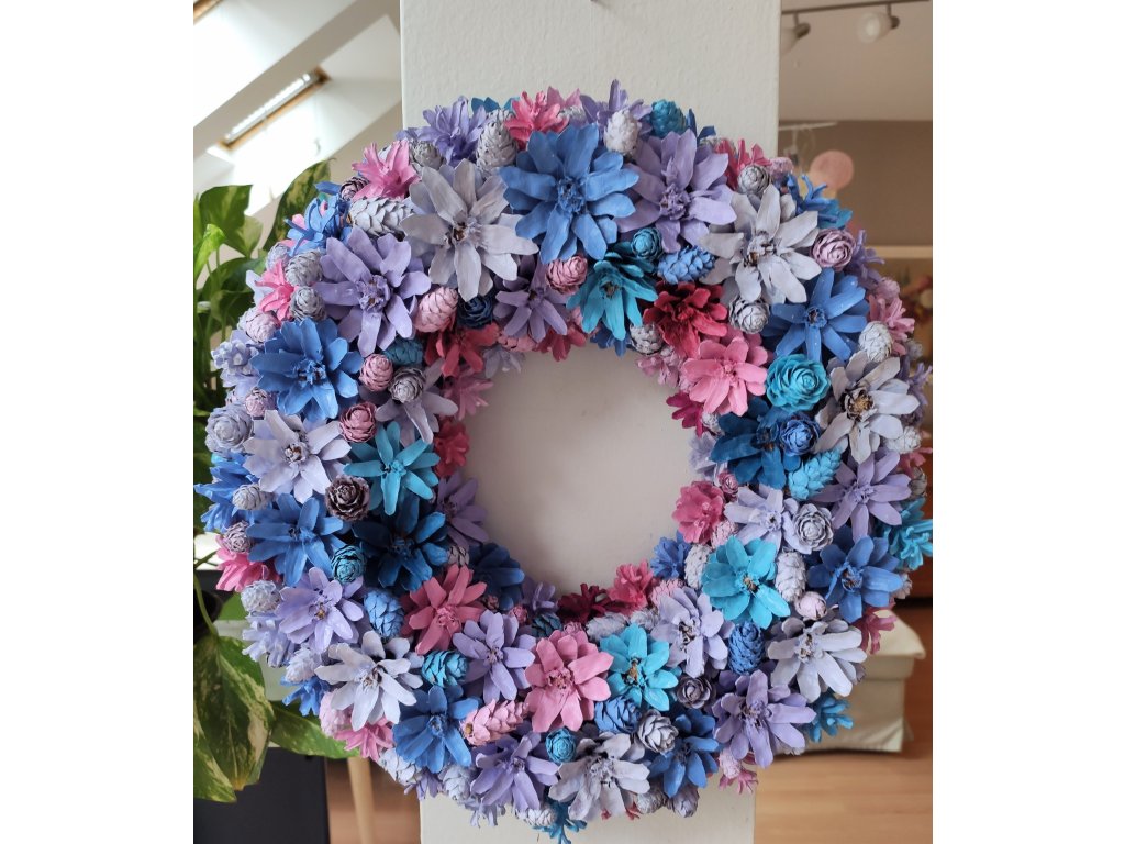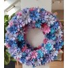 Věnec z borovicových šišek ve fialových tónech s tmavě modrou a decentní růžovou.