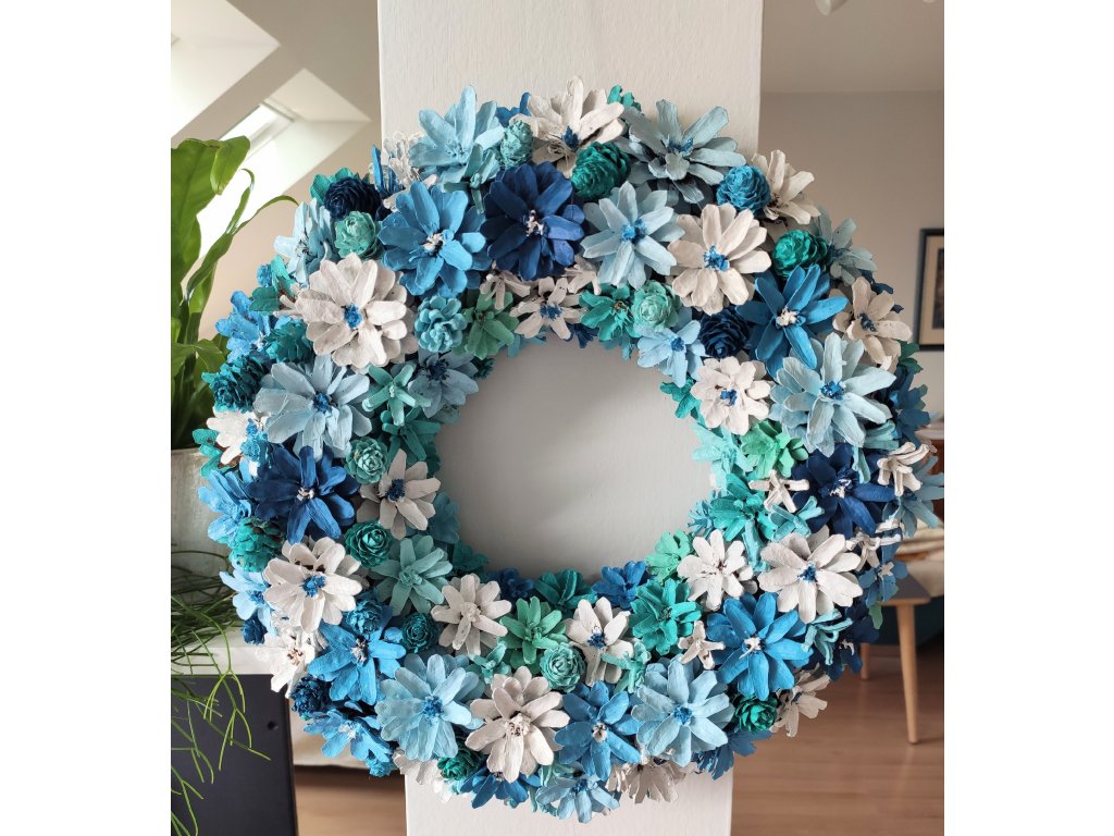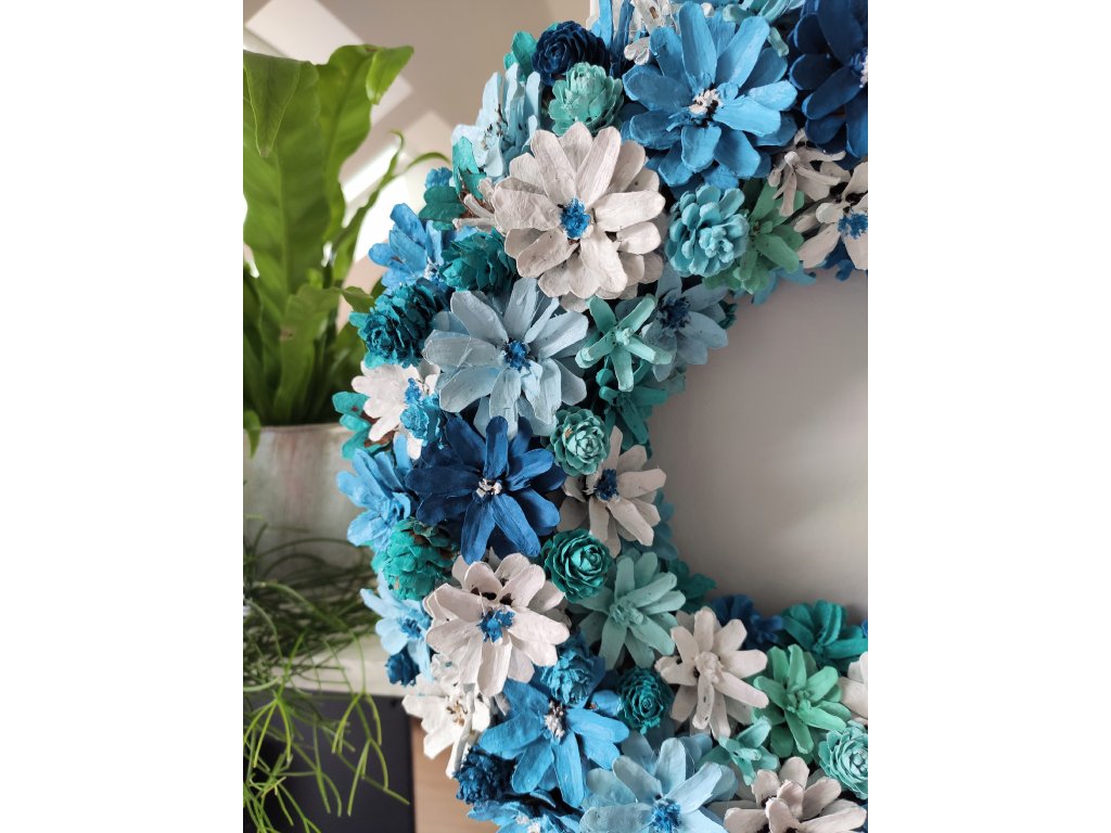 Věnec z borovicových šišek v modrých tónech. Průměr cca 37 cm. Vydrží velmi dlouho i venku pod stříškou, pokud je chráněný před deštěm.