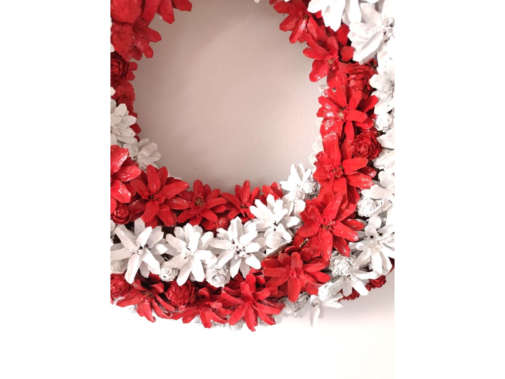 Věnec z borovicových šišek v kombinaci jasně červené a bílé. Průměr 30 nebo 37 cm.