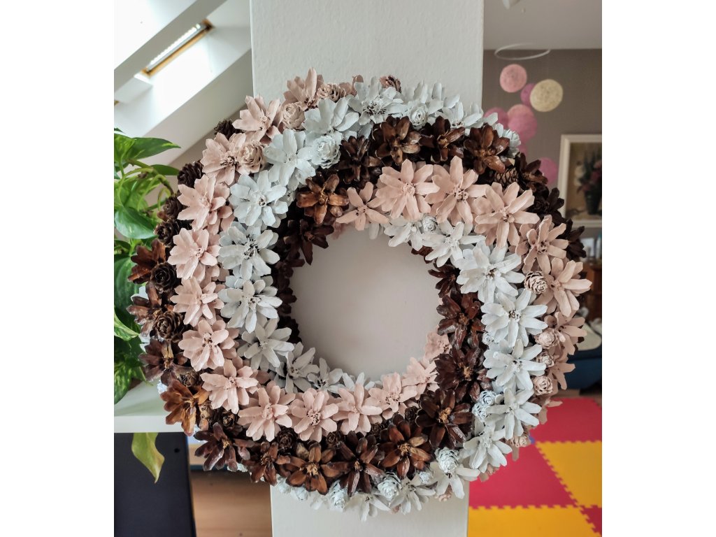 Věnec má průměr 30 nebo 37 cm. Vydrží velmi dlouho i venku pod stříškou, pokud je chráněný před deštěm. V interiéru vydrží roky. Bude zajímavý jak na dveřích,tak krásně vynikne i na zdi.