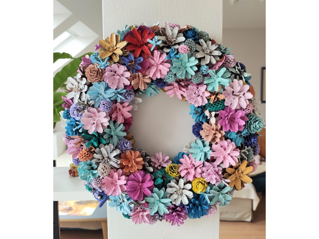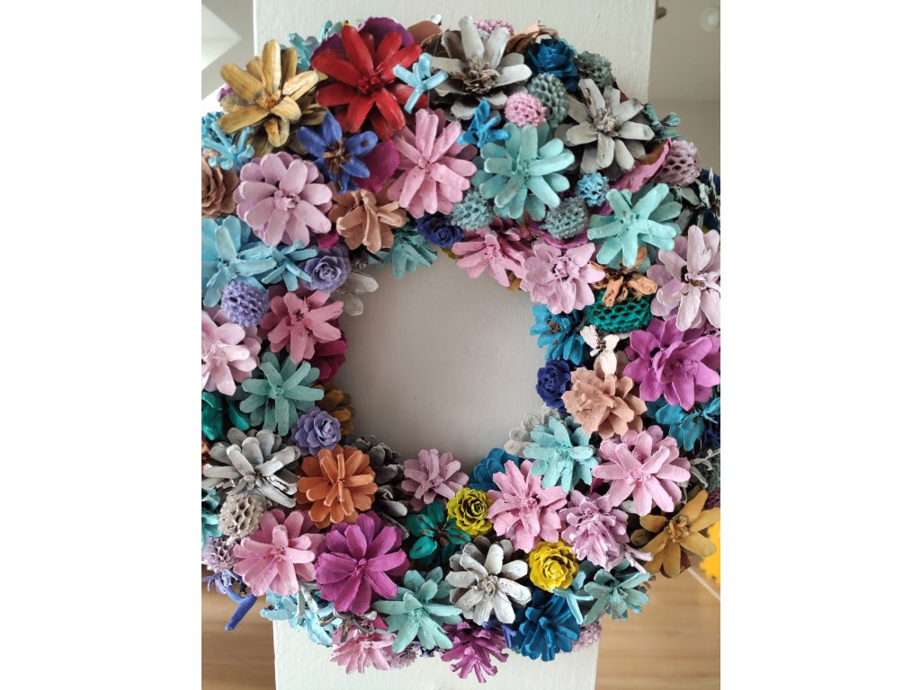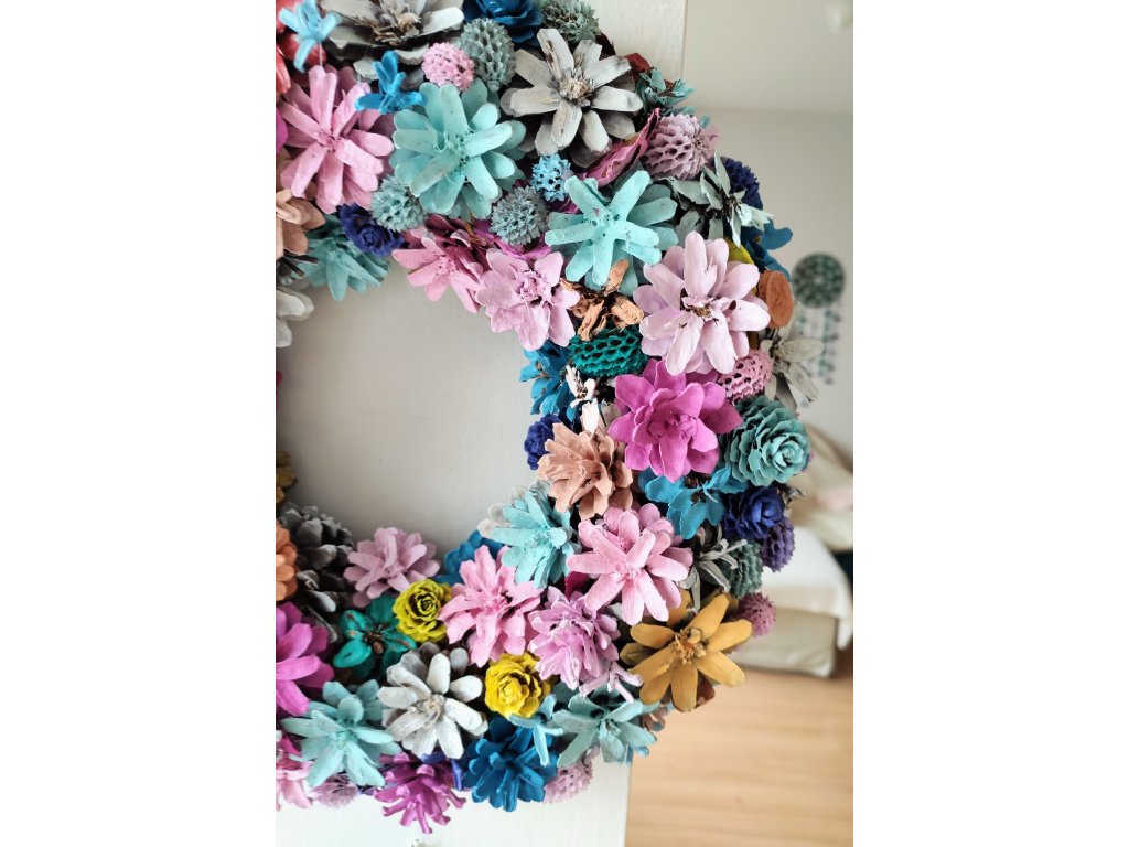 Věnec z borovicových šišek v jemných jarních tónech. Průměr cca 30 cm. Vydrží velmi dlouho i venku pod stříškou, pokud je chráněný před deštěm.