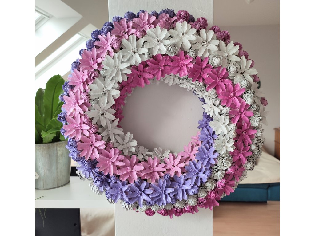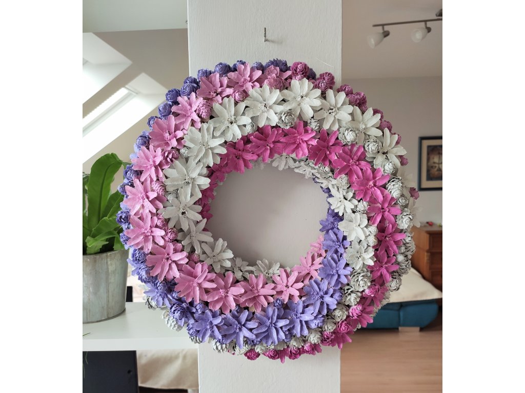 Věnec z borovicových šišek ve výraznější růžové, fialkové a bílé. Průměr cca 37 cm. Vydrží velmi dlouho i venku pod stříškou, pokud je chráněný před deštěm.
