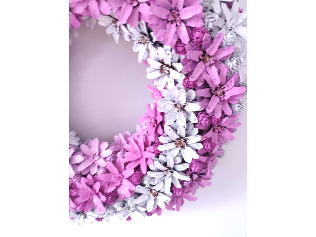 Věnec z borovicových šišek v dvoubarevné decentní kombinaci růžové a bílé.