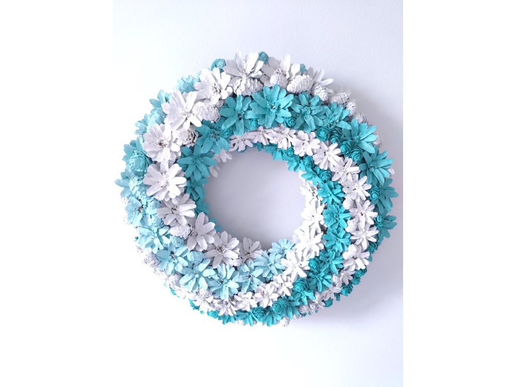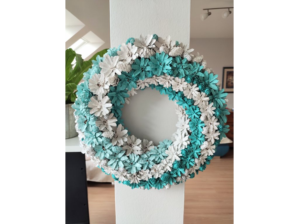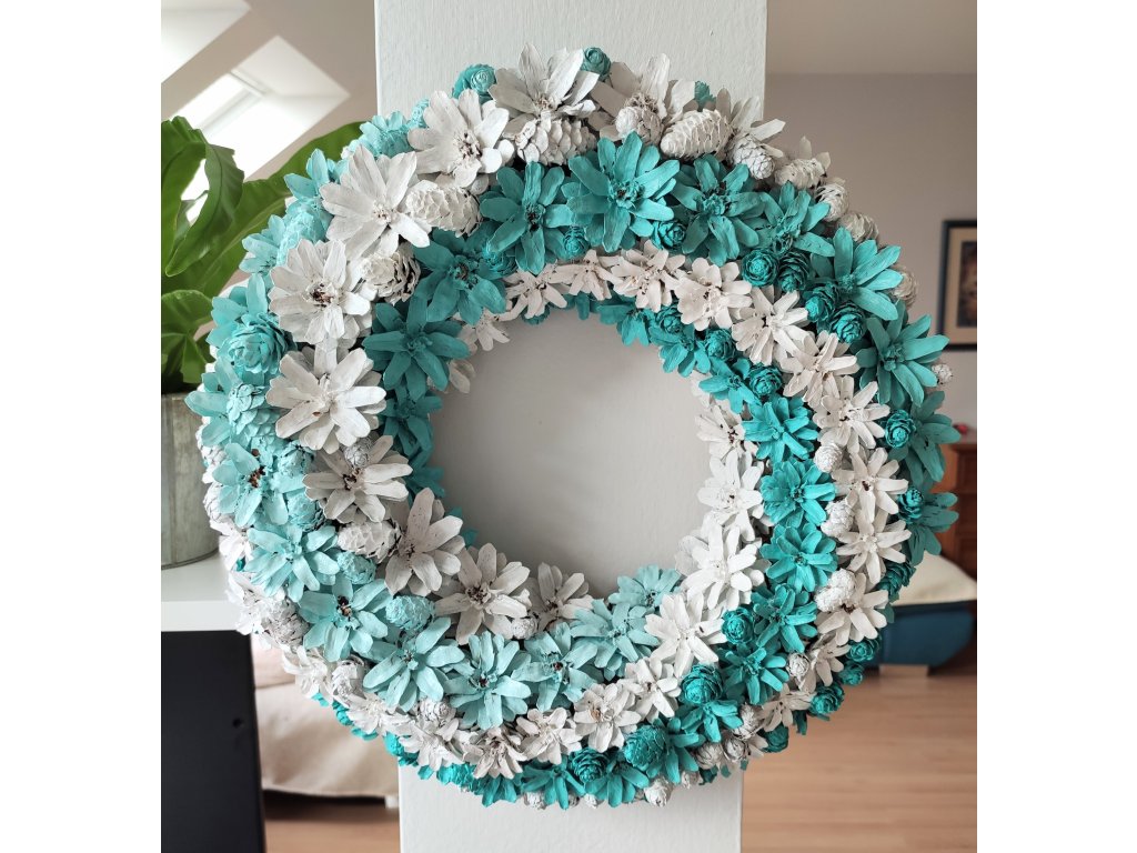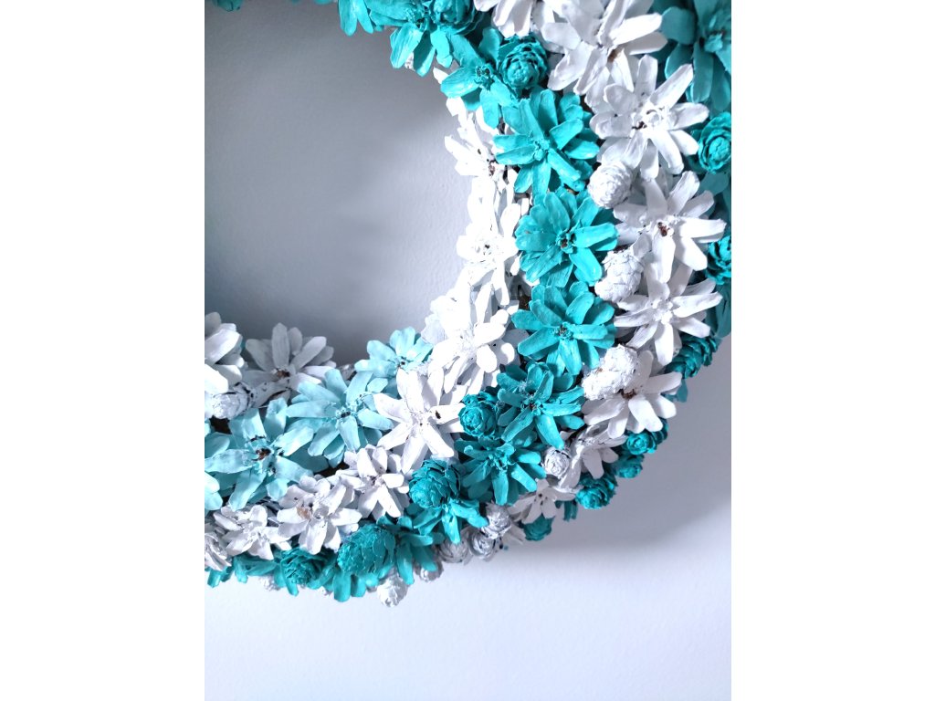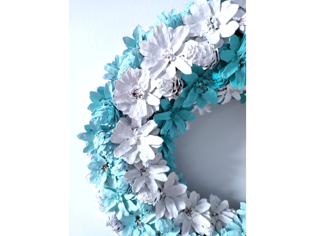 Věnec z borovicových šišek v elegantní dvoj kombinaci tyrkysové a bílé. Průměr cca 37 cm. Vydrží velmi dlouho i venku pod stříškou, pokud je chráněný před deštěm.