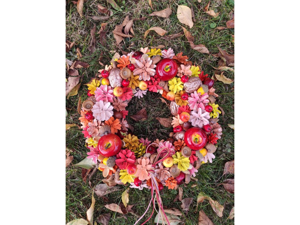Věnec z borovicových šišek a umělých jablíček laděný do zářivých podzimních tónů. Průměr věnce je 30 cm. Vydrží velmi dlouho i venku pod stříškou, pokud je chráněný před deštěm.