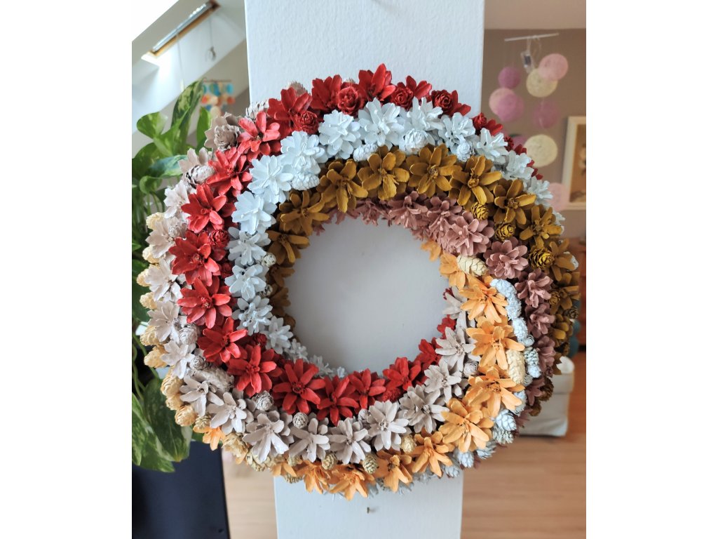 Věnec má průměr 30 nebo 37 cm. Vydrží velmi dlouho i venku pod stříškou, pokud je chráněný před deštěm. V interiéru vydrží roky. Bude zajímavý jak na dveřích,tak krásně vynikne i na zdi.