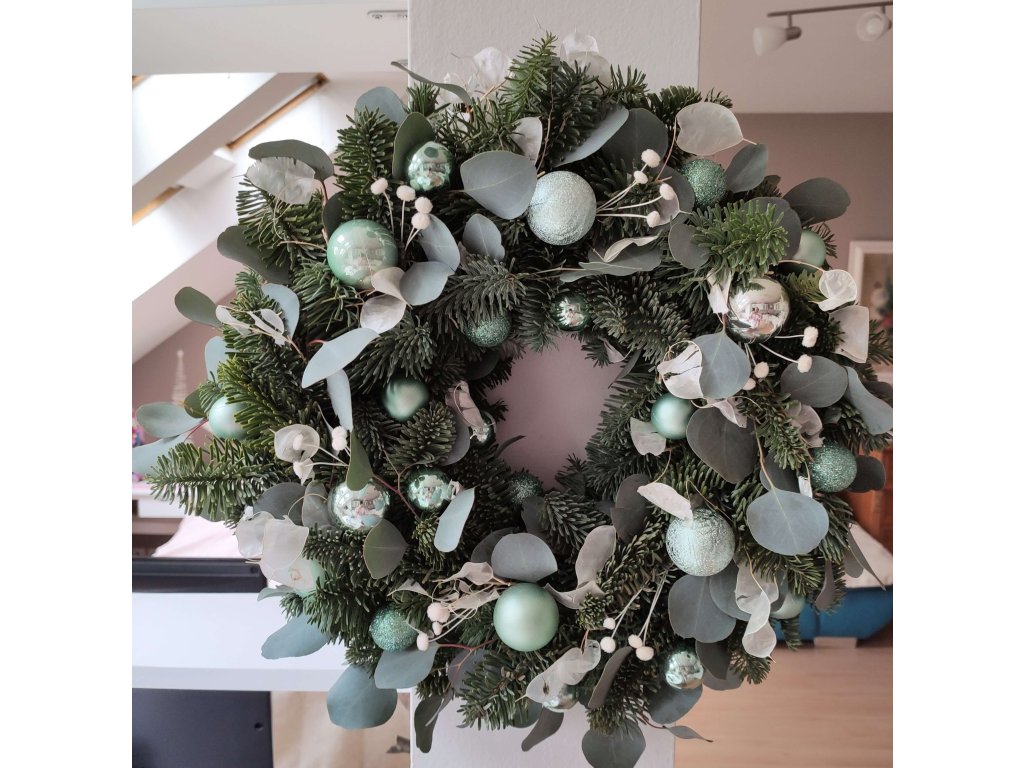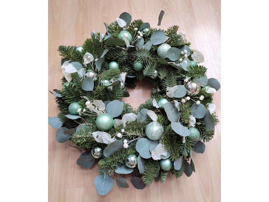 Krásný vánoční věnec dekorovaný skleněnými kouličkami v zelené barvě Mint je bohatě vyzdoben eukalyptem, který lehce voní a dlouho vydrží. Základem je jedličkové chvojí, které je doplněné bohatým množstvím ekalyptových větviček a stabilizovaných květin. Skleněné kouličky věnec krásně tón v tónu zdobí a dělají ho decentní.